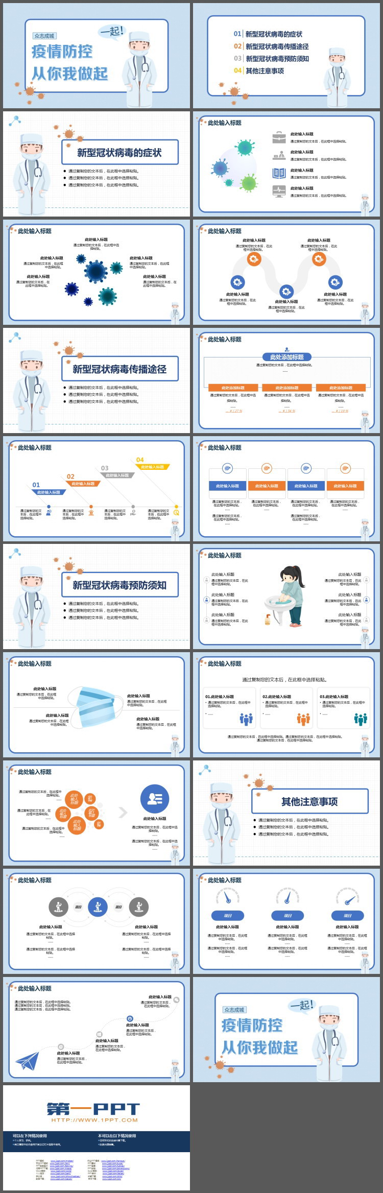 PowerPoint模板内容页,由18张蓝色橙色配色的幻灯片图表,搭配PPT文字排版。另外使用了口罩、洗手等插图装饰。