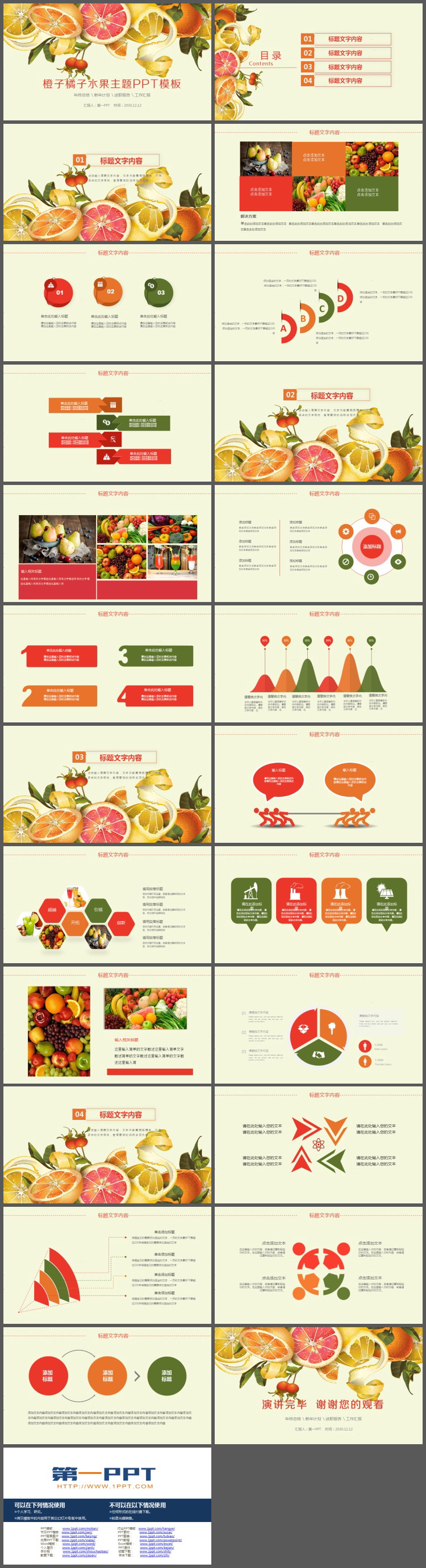 PowerPoint模板内容页,由22张红色、橙色、绿色、三种颜色配色的幻灯片图表,搭配PPT文字排版。另外使用了多种水果PPT插图装饰。