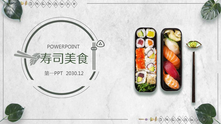 PPT模板使用了两盒颜值与营养丰富的寿司背景图片。周围使用绿色叶子装饰。左侧放置绿色圆形,填写寿司美食PPT标题。