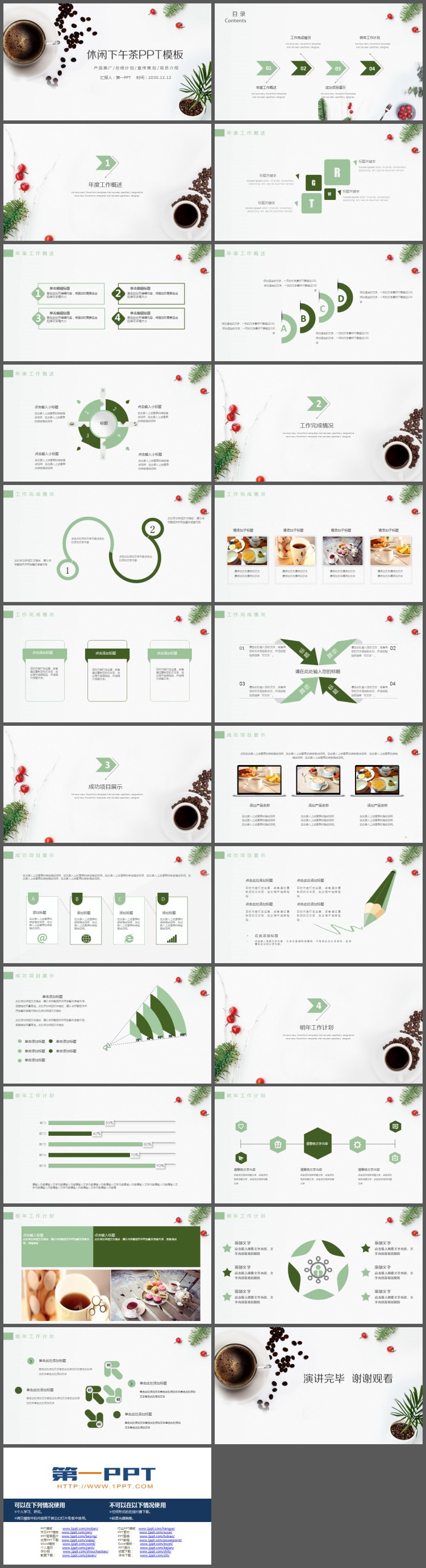 PowerPoint模板内容页,由22张绿色简洁幻灯片图表,搭配PPT文字制作。另外使用了甜点插图、红茶插图等排版。