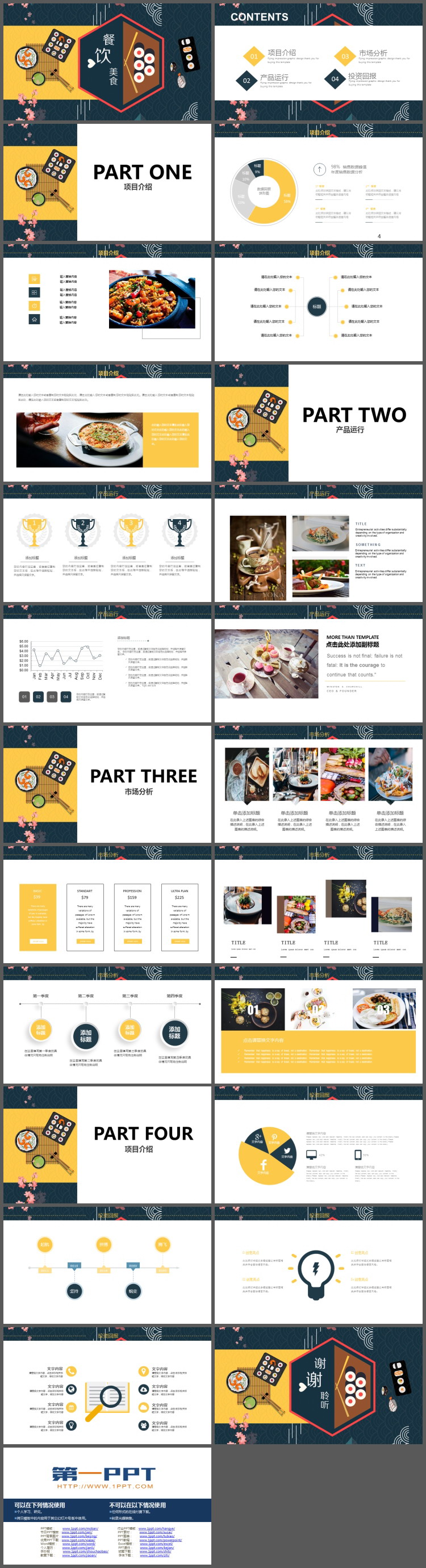PowerPoint模板内容页,由22张蓝黄配色的幻灯片图表,搭配PPT文字排版。另外使用了多种美食菜品插图装饰。