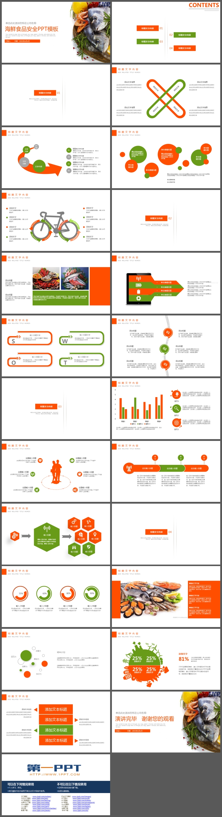 PowerPoint模板内容页,由22张橙色绿色配色的幻灯片图表,搭配PPT文字排版。另外使用了多张海鲜食品插图装饰。
