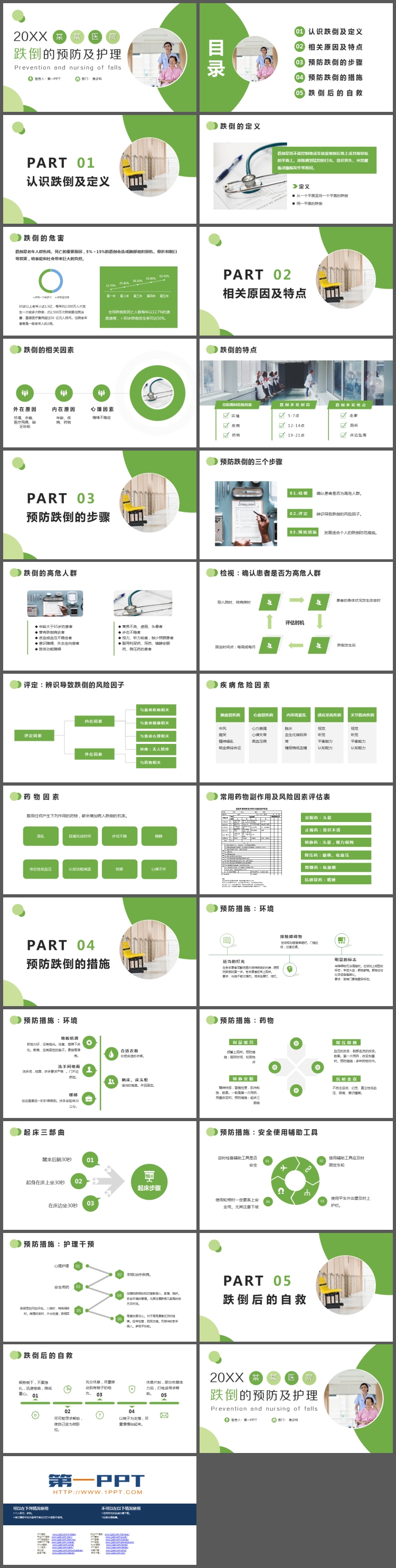 PPT以绿色为主色调设计。PPT封面使用了一张护理人员背景图片,左侧填写跌倒的预防及护理PPT标题。