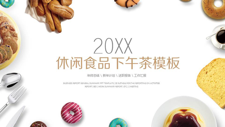 PPT模板封面使用了烘焙面包、甜甜圈、咖啡等背景图片。中间填写休闲下午茶PPT标题。