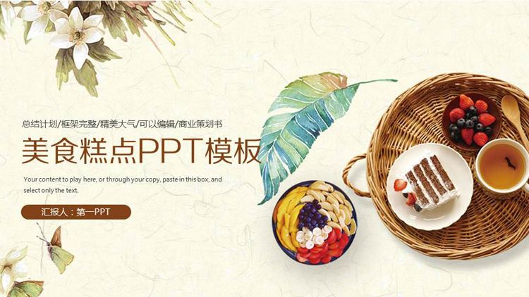PPT模板封面使用了水彩绘制的白色花卉绿色叶子,和精致的糕点PPT背景图片。左侧填写PPT标题。