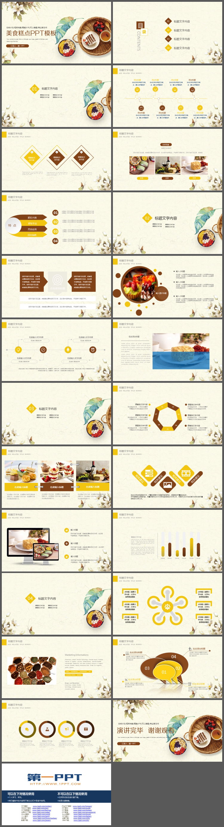 PowerPoint模板内容页,由22张棕色黄色配色的幻灯片图表,搭配PPT文字排版。另外使用了各种各样的糕点插图、水果插图、红酒插图装饰。