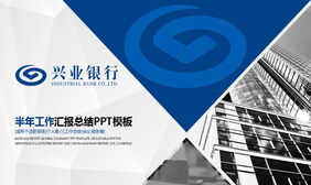 PPT模板封面使用了商业建筑、蓝色彩带背景图片。右上角放置兴业银行logo,中间填写兴业银行工作总结汇报PPT标题。