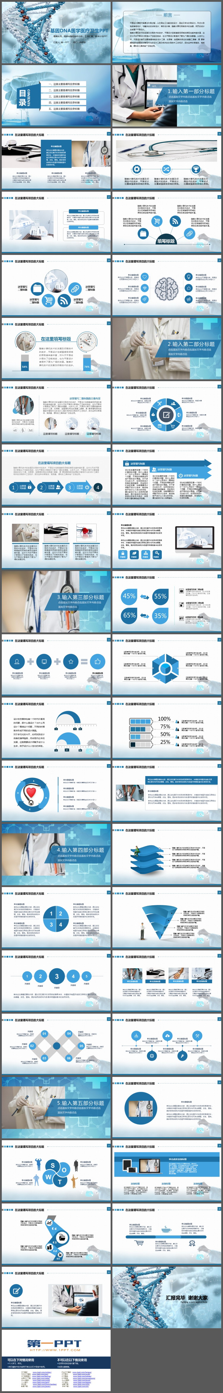这是一套蓝色立体DNA链条背景的医疗医学生命科学PPT模板,共42页;