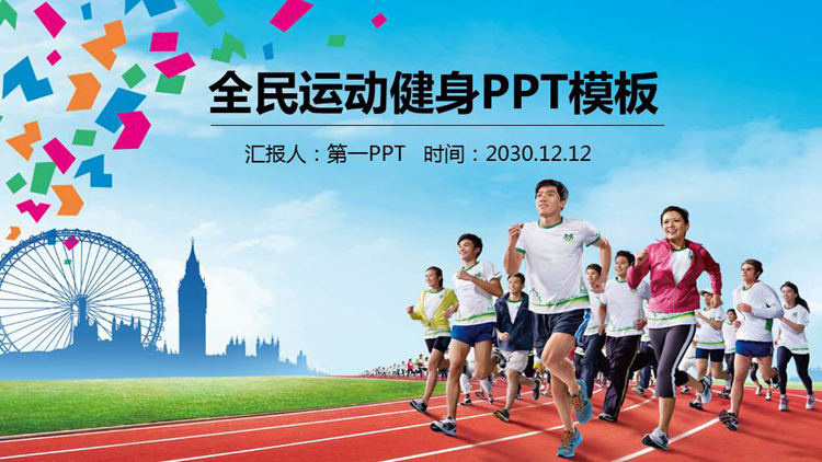 PPT模板封面使用了一群人在跑道上跑步健身的背景图片。中间填写全民健身运动PPT标题。界面背景与健身PPT主题搭配。