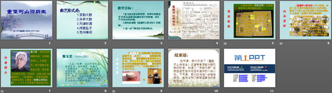 结束语:这节课,我们欣赏了《重整河山待后生》这首带有京韵大鼓风格的歌曲,知道了“京韵大鼓”是我国曲艺音乐花园中盛开的一朵小花。下节课,我们还将进一步走进曲艺,去关注和了解我国其他的曲艺形式!