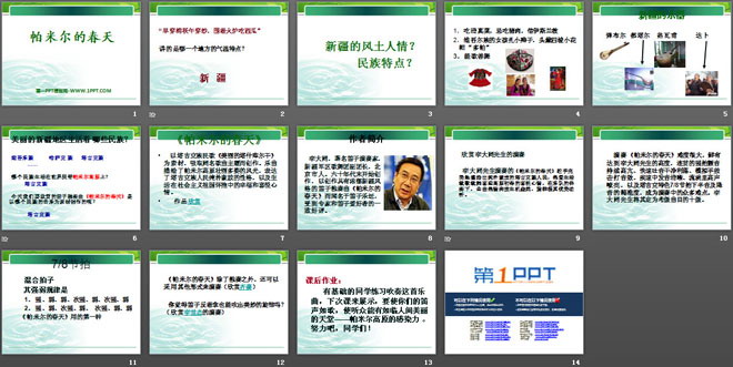 关键词:帕米尔的春天教学课件,九年级上册音乐PPT课件下载,九年级音乐幻灯片课件下载,帕米尔的春天PPT课件下载,.PPT格式;