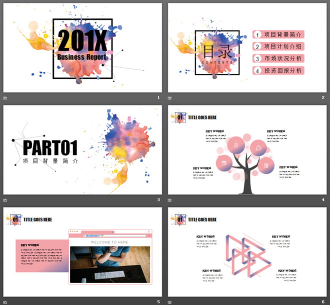 关键词:创意墨迹、彩色水彩幻灯片背景图片,动态商业融资计划书PPT模板,彩色扁平化幻灯片图表,.PPTX格式;