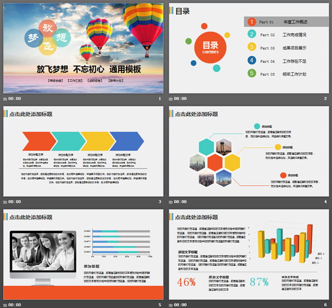 关键词:蓝天白云、热气球、云海幻灯片背景图片,动态工作总结PPT模板,彩色通用幻灯片图表,.PPTX格式;