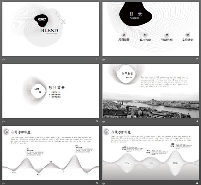 关键词:黑色极简艺术PPT模板,曲线、线条、等高线PowerPoint背景图片,黑白图文混排幻灯片图表,.PPTX格式;