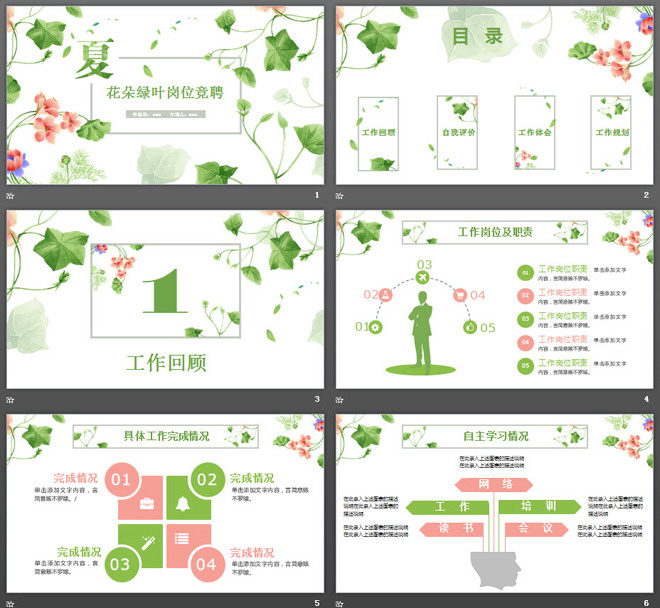 关键词:绿色藤蔓植物、绿叶、花朵幻灯片背景图片,动态清新岗位竞聘PPT模板,.PPTX格式;