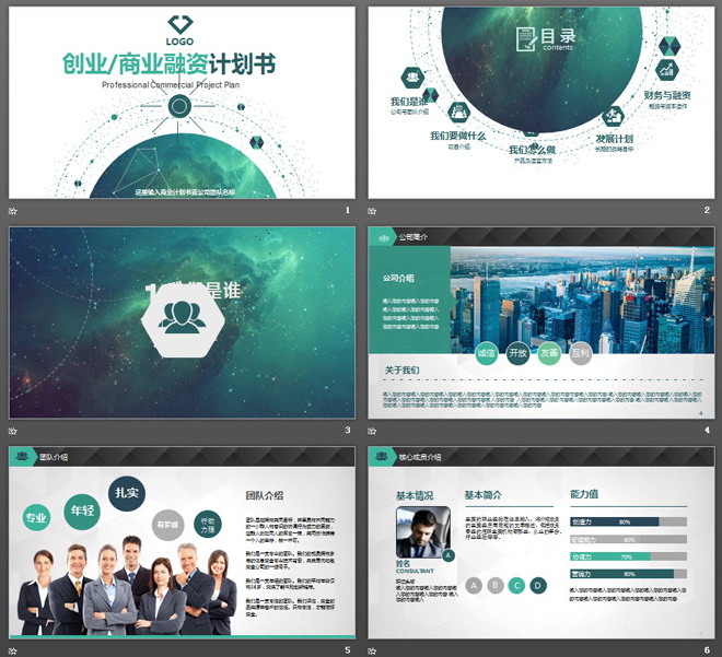 关键词:星空、星云幻灯片背景图片,动态商业融资计划书PPT模板,绿色扁平化PowerPoint图表,.PPTX格式;