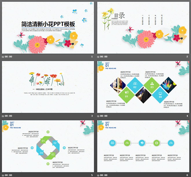 关键词:彩色矢量花卉幻灯片背景图片,动态唯美艺术PPT模板,蓝绿扁平化PowerPoint图表,韩范幻灯片模板,.PPTX格式;