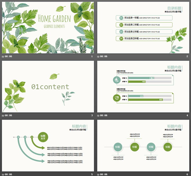 关键词:水彩手绘绿叶PowerPoint背景图片,清新毕业答辩PPT模板,绿色扁平化幻灯片图表,艺术手绘幻灯片素材,.PPTX格式;