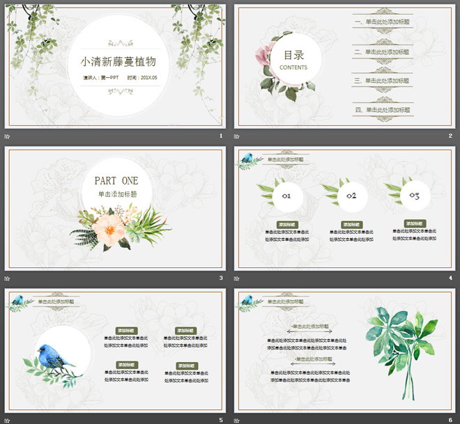 这是一套精致淡雅清新风格,绿色藤蔓植物背景PPT模板,共21张。第一PPT模板网提供植物幻灯片模板免费下载;