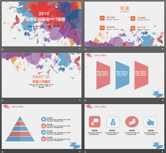 关键词:彩色颜料、炫彩墨迹幻灯片背景图片,动态创意设计PowerPoint模板,蓝色红色搭配扁平化PPT图表,.PPTX格式;