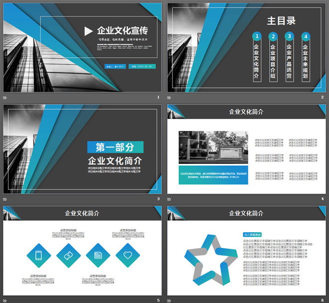 关键词:灰色商务建筑幻灯片背景图片,蓝色扁平化PowerPoint图表,动态公司简介PPT模板,.PPTX格式;