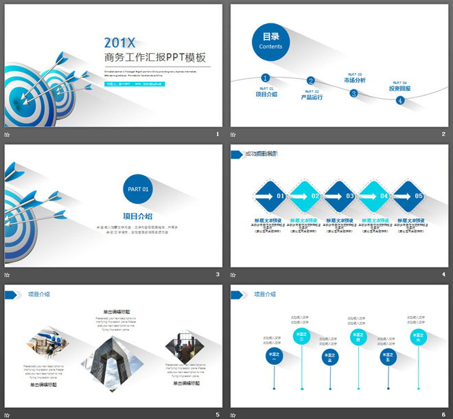 这是一套带有阴影效果的,蓝色箭头命中靶心背景,商务PPT模板。共24张。第一PPT模板网提供精美商务幻灯片模板免费下载;