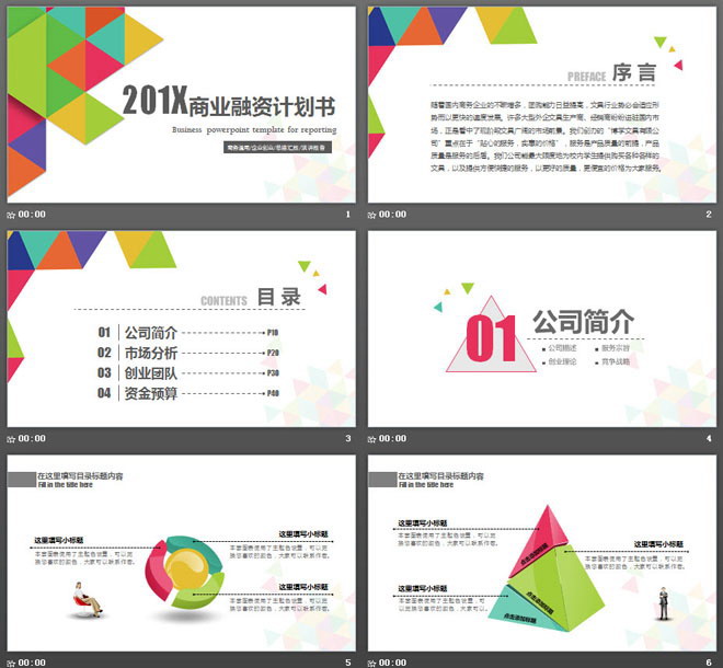 关键词:三角形拼图、多边形PowerPoint背景图片,彩色扁平化幻灯片图表,动态商业融资计划书PPT模板,通用商务PowerPoint模板,.PPTX格式;