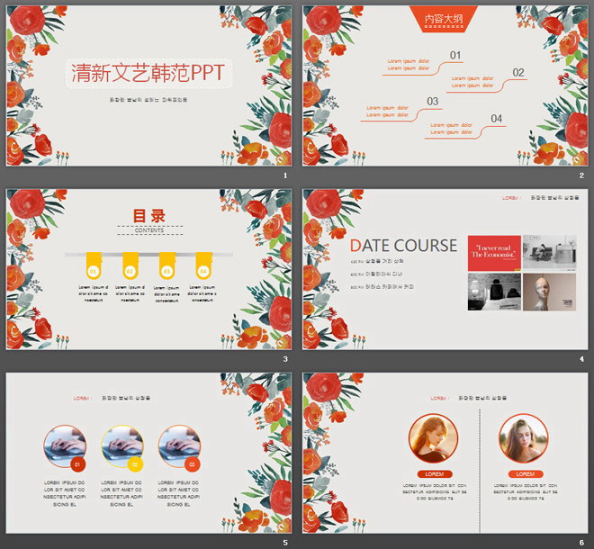 这是一套橙色水彩手绘花朵背景的,韩范艺术PPT模板,共26张。第一PPT模板网提供精美韩国风幻灯片模板免费下载;