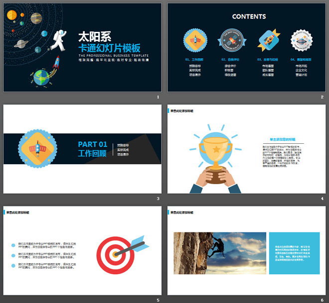 关键词:太阳系的星球、宇航员、火箭升空PowerPoint背景图片,彩色扁平化幻灯片图表,动态卡通风格PPT模板,.PPTX格式;