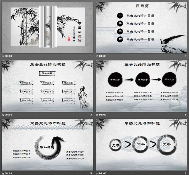 这是一套黑白水墨竹子动态卷轴背景的,中国风样式PPT模板,共12张。第一PPT模板网提供精美水墨中国风幻灯片模板免费下载;
