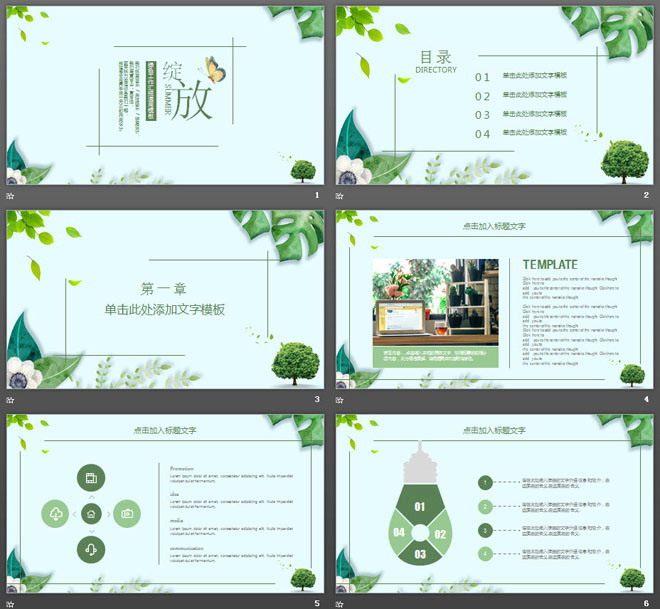 关键词:绿叶、小树、叶子、植物PPT背景图片,绿色扁平化幻灯片图表,清爽夏日主题幻灯片模板,.PPT格式;