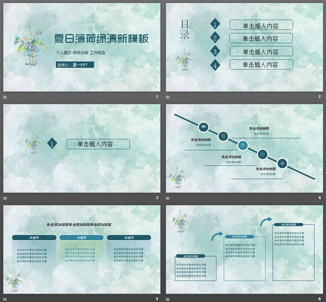 关键词:手绘花卉、清新水彩PPT背景图片,绿色扁平化幻灯片图表,淡雅简洁PPT模板,.PPTX格式;