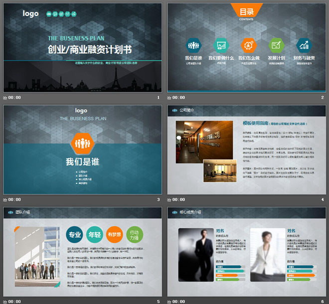 关键词:多边形网格、黑色城市剪影PowerPoint背景图片,彩色扁平化幻灯片图表,动态商业融资计划书PPT模板,.PPTX格式;