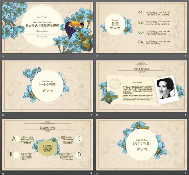 关键词:清新花鸟、图案PowerPoint背景图片,黄色蓝色搭配复古风格幻灯片图表,动态艺术设计PPT模板,.PPTX格式;