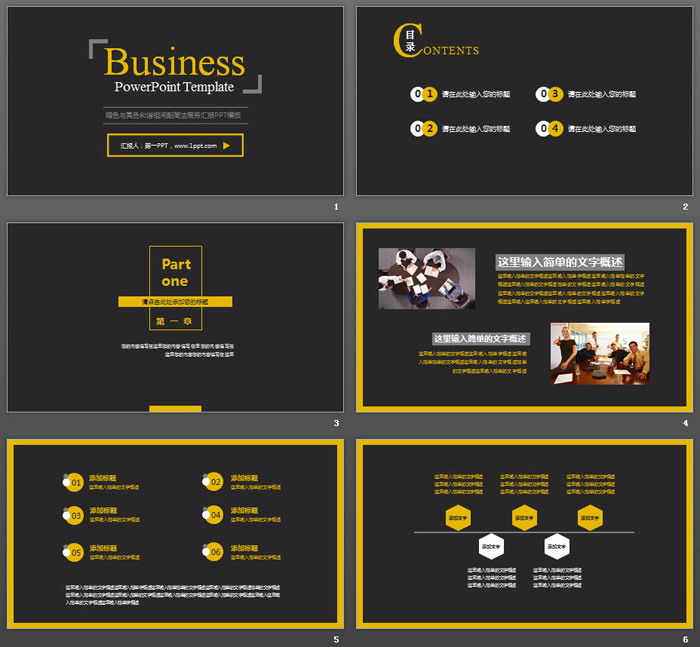 这是一套黑色背景黄色圈边设计的,简洁风格商务汇报PPT模板,共27张。第一PPT模板网提供精美商务幻灯片模板免费下载;