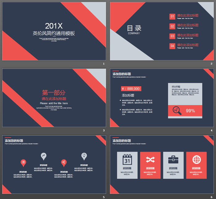 这是一套简洁蓝红英伦风格的,通用商务PPT模板,共24张。第一PPT模板网提供精美简洁幻灯片模板免费下载;