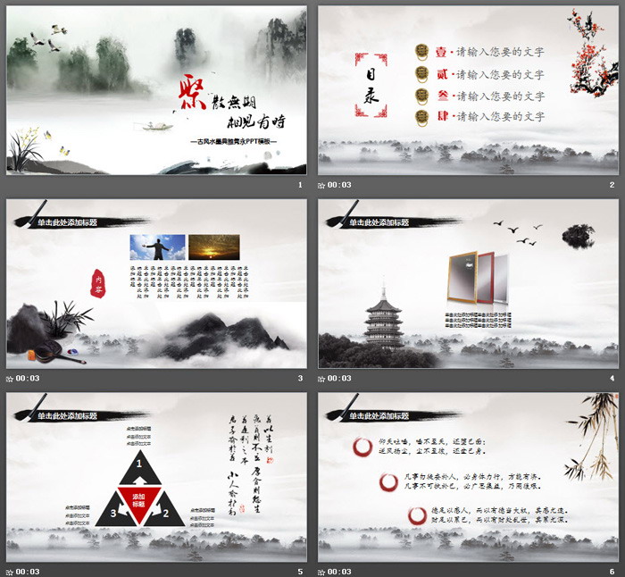 关键词:水墨山水画、梅花、牵牛花、墨松、荷花PowerPoint背景图片,黑色水墨幻灯片背景图片,动态雅致中国风PPT模板,.PPTX格式;