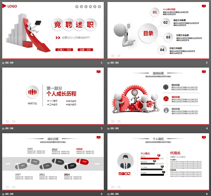 关键词:立体小人、白色小人、3d小人幻灯片背景图片,实用动态个人竞聘PPT模板,红色微立体PowerPoint图表,.PPTX格式;