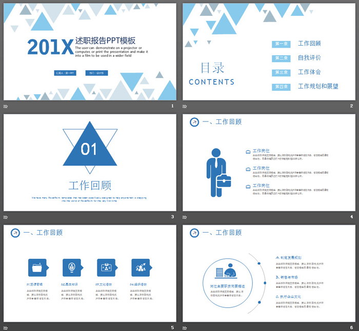 这是一套蓝色三角形背景的,个人述职报告PPT模板,共25张。第一PPT模板网提供精美多边形背景幻灯片模板免费下载;