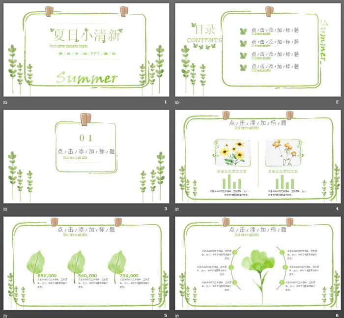 关键词:手绘植物、手绘绿叶幻灯片背景图片,清爽夏日主题PPT模板,清新绿色扁平化PowerPoint图表,.PPTX格式;