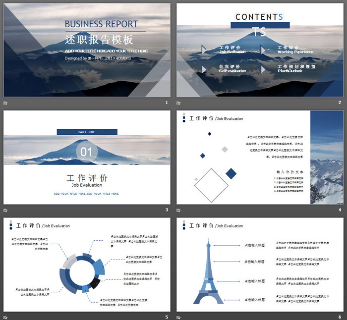 关键词:蓝天白云、山峰、高山PowerPoint背景图片,蓝色扁平化幻灯片图表,动态个人述职报告PPT模板,.PPTX格式;