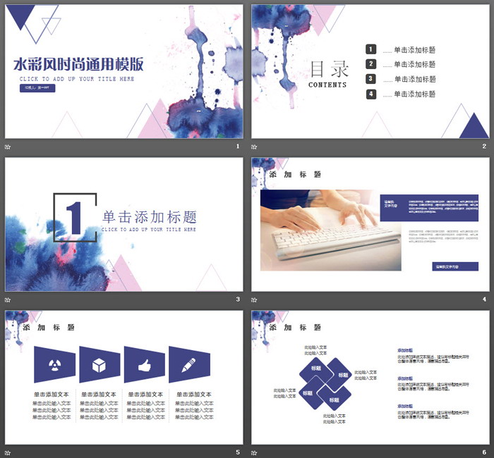 关键词:水彩晕染、墨迹、三角形PowerPoint背景图片,蓝色扁平化幻灯片图表,动态艺术设计PPT模板,.PPTX格式;