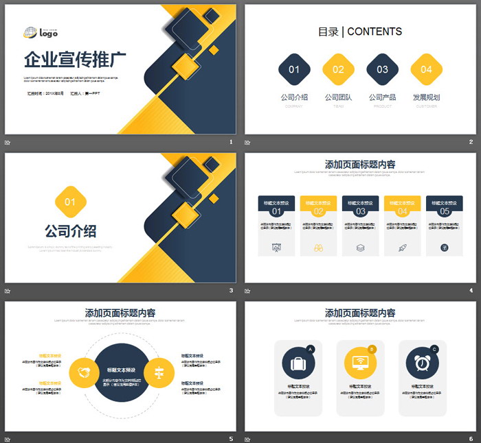 简洁蓝黄搭配扁平化企业宣传推广PPT模板