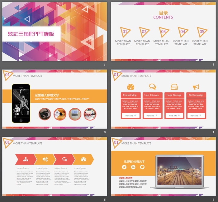 关键词:彩色多边形、三角形PowerPoint背景图片,红色橙色搭配扁平化幻灯片图表,炫彩时尚PPT模板下载,.PPTX格式;