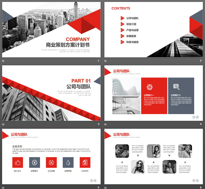 这是一套红灰商业建筑群背景商业计划书PPT模板,共26张。