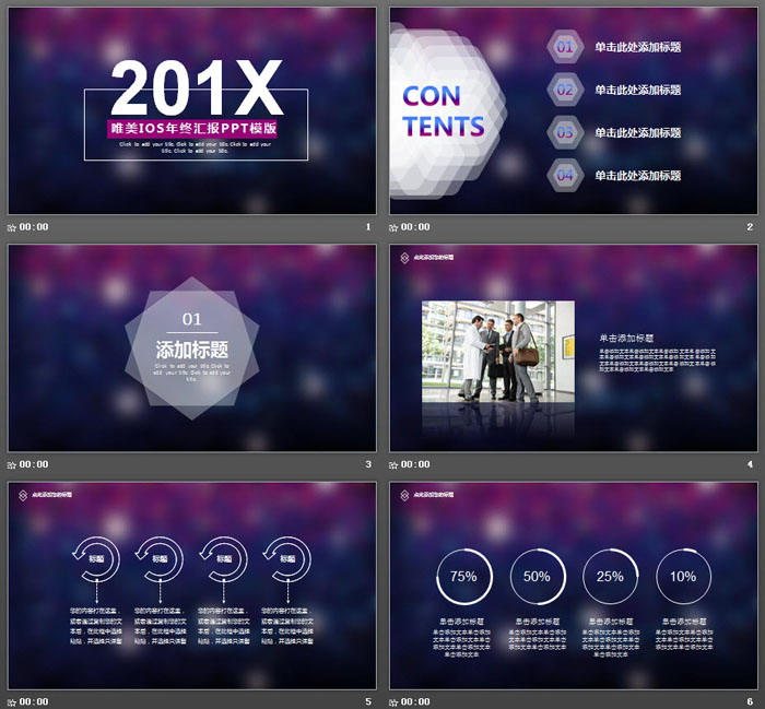 幻灯片模板使用了蓝色到紫色的,梦幻朦胧渐变设计。与当前流行的iOS风格所一致,炫酷易识别。