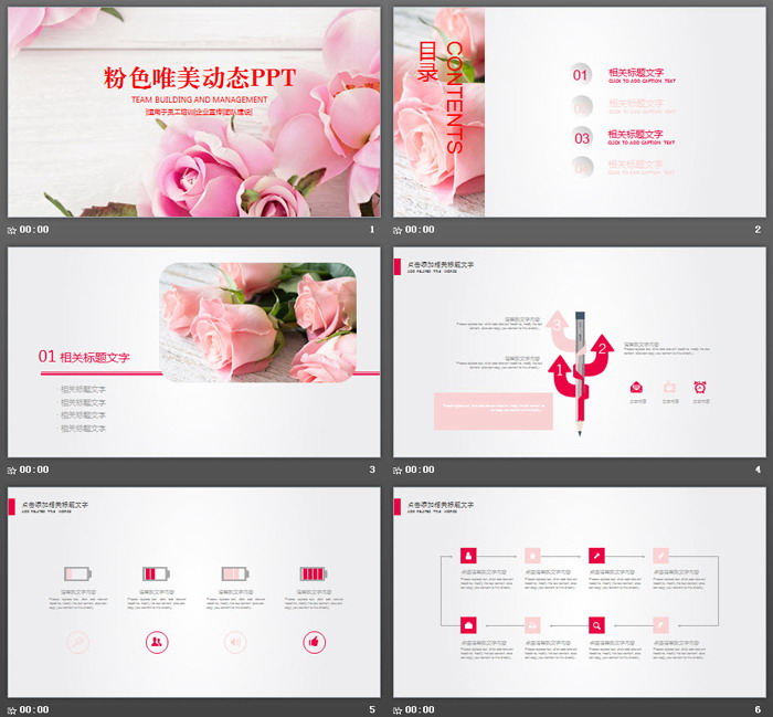 这是一套粉色唯美玫瑰背景的植物花卉主题PPT模板,共22张。