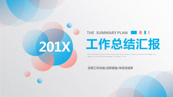 幻灯片模板使用了细微颗粒质感的灰色底图。PPT模板封面使用了多个不规则排列的,橙色泡泡与蓝色泡泡进行组合。在泡泡上填写工作汇报年份,右侧PPT标题文字使用蓝色黑体。
