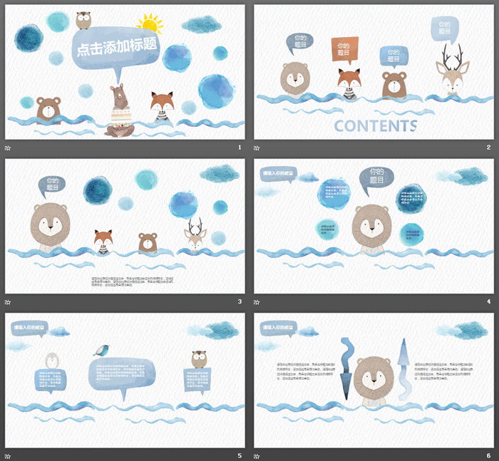 这是一套蓝色可爱卡通呆萌小动物PPT模板,共22张。