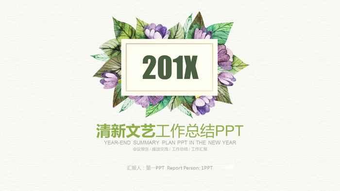 幻灯片模板封面使用了一团绿叶紫花植物作为背景图片,中间放置一个矩形文本框,填写PPT标题。